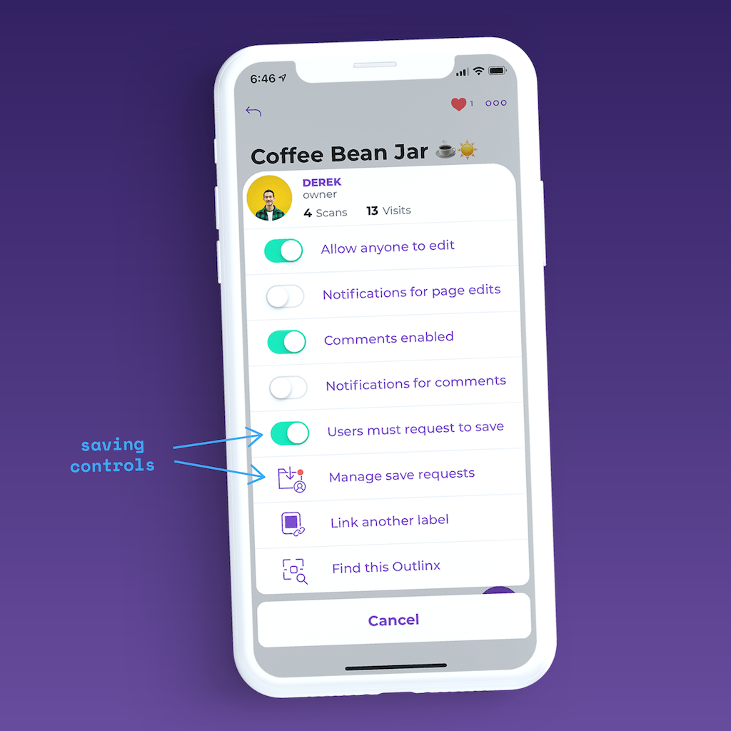 By default, when you create new pages, anyone who scans your Outlinx can save the page to their Folders list. To disable this, click on the ellipses menu on your note page and use the toggle to enable the “Users must request to save” feature. For your privacy, anyone who wants to save your page in their Outlinx app needs your approval before they can save it.