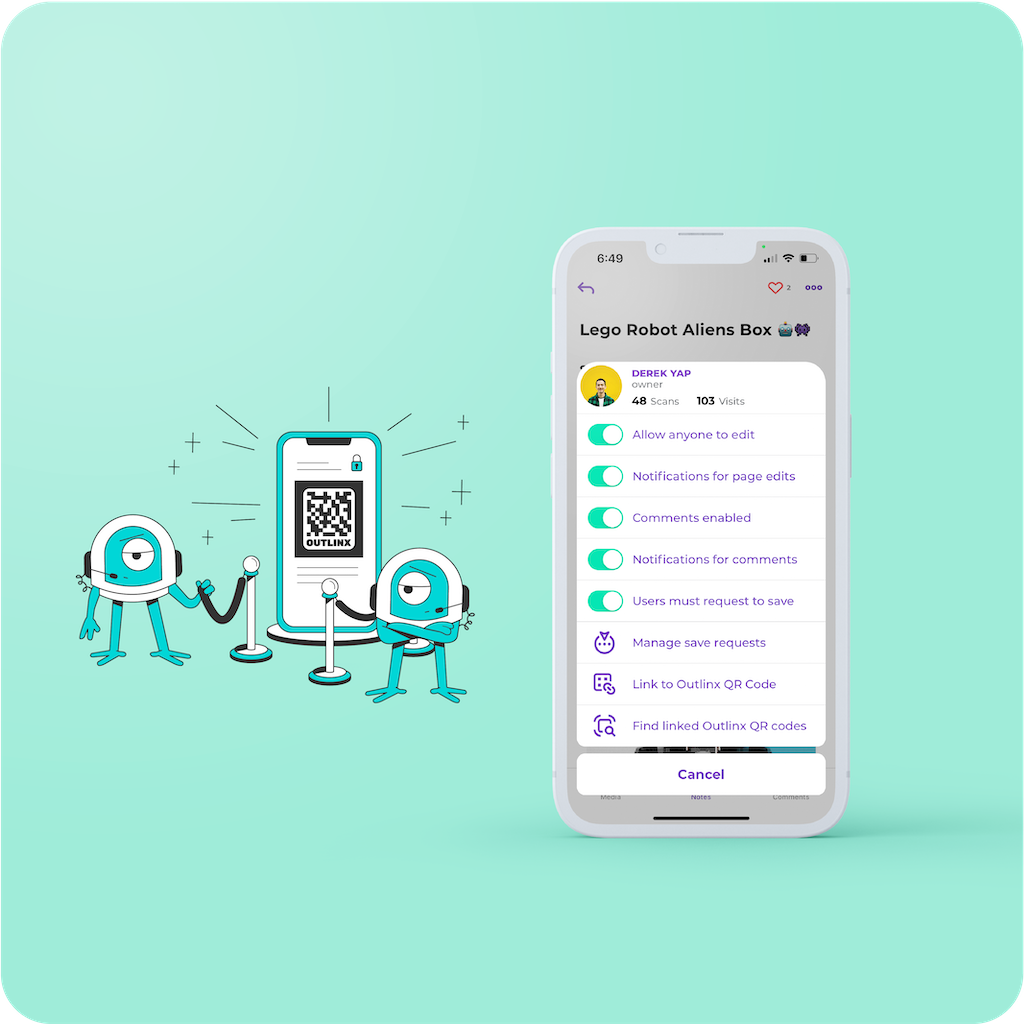 Our app makes it easy to create digital note pages and link them to our QR Smart Stickers. Add text, images, videos, comments, and more. Each Outlinx page has 3 spaces; the Notes Space, the Media Space, and the Comments Space.